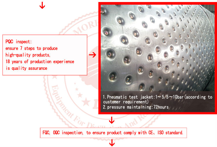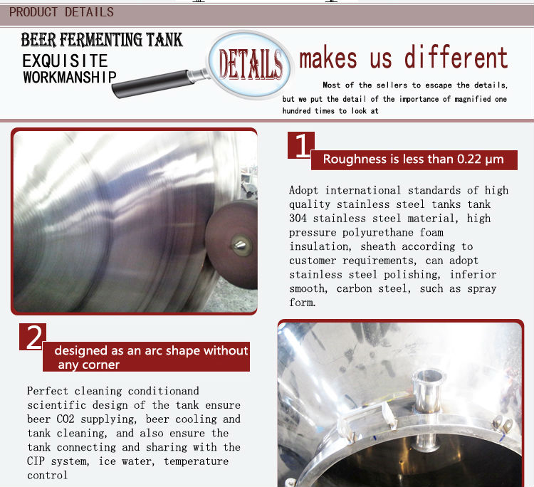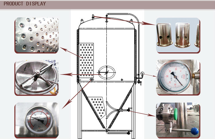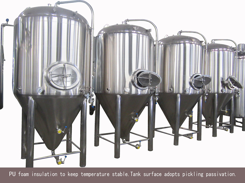 The whole set equipment is made of austenitic stainless steel. The cooling jacket adopts dimple jacket. The jackets are provided at tank body and conical bottom to effectively increase the cooling speed. Heat exchanging area of jacket of different proportions can be allocated according to customers' technological requirements. Widly used in brewery, bar, hotel, amily etc.