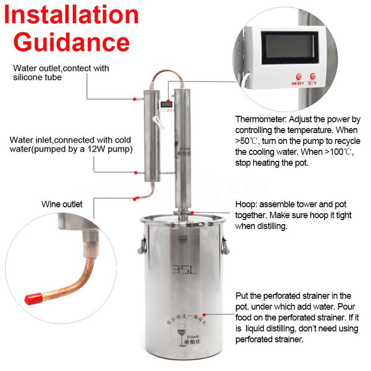 This machine is all made of 304 stainless steel which has been argon welded thus avoiding any of the health problems associated with copper and solder constructed still.