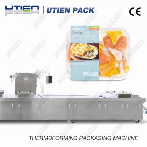 Automatic Stretch Forming Vacuum PackageApplicationThis packaging machine is a fully automatic vacuum packaging machine and is applicable for vacuum, gas-filling and skin packaging of foods, meat products (frozen meat, sausage), seafood (smoked fish