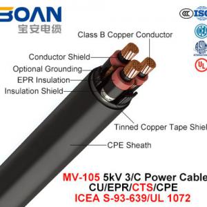 MV-105, Power Cable, 5 KV, 3/C, Cu/EPR/Cts/CPE (ICEA S-93-639/NEMA WC71/UL 1072)FeaturesUL Listed as MV-105. True Triple extrusion system and closed handling raw materials system,