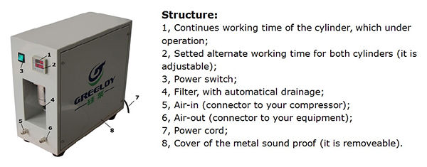 # Imported adsorbent and pneumatic components, keep high quality of outlet air flow; |