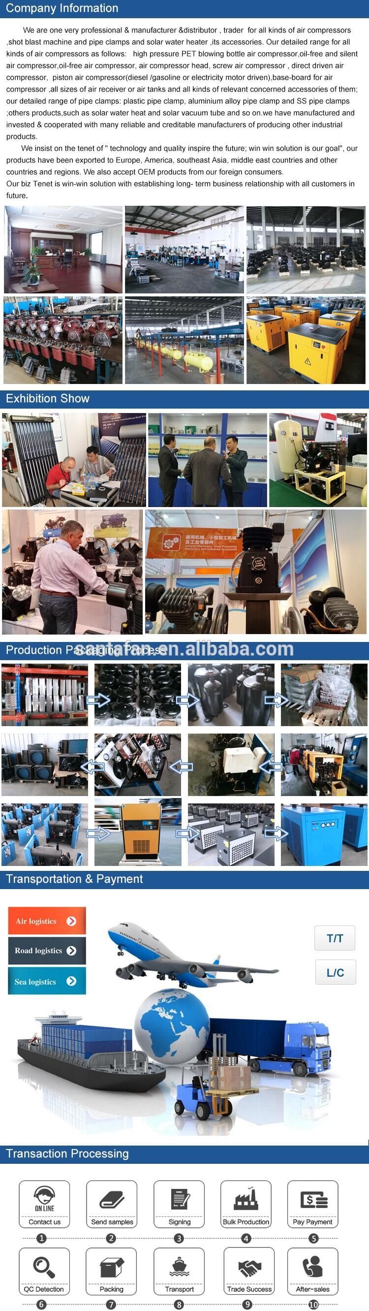 We are one very professional composite biz corporation of trader and manufacturer and distributor for all kinds of air compressors ,shot blast machine and pipe clamps and solar water heater ,its accessories. Our detailed range for all kinds of air compressors as follows: piston air compressor(diesel /gasoline or electricity motor driven), oil-free air compressor, air compressor pump/ head, screw air compressor ,oil-free and silent air compressor and main-board or base-board for air compressor and all kinds of relevant concerned accessories for them; our detailed range of pipe clamps: plastic pipe clamp, aluminium alloy pipe clamp and SS pipe clamps ;others products,such as solar water heat and solar vacuum tube and so on.we have invested & cooperated with many reliable and creditable large and medium manufacturers of producing all captioned industrial products.