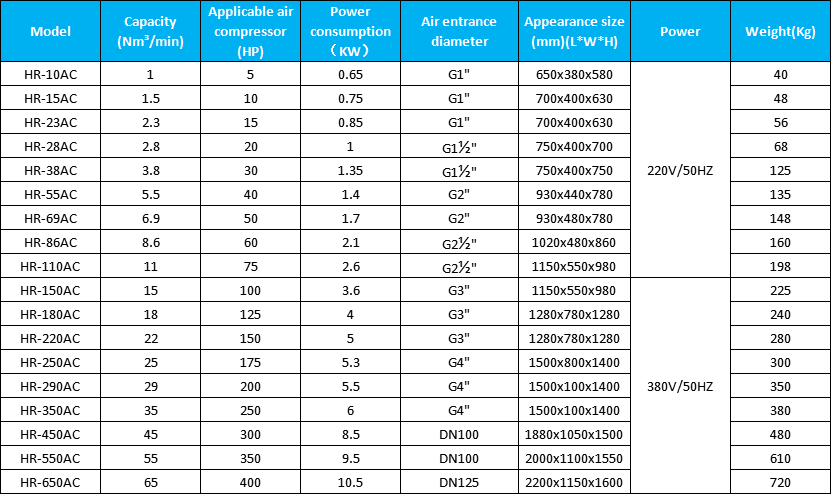 Technical paraments of Air cooled Refrigerated Air Dryer