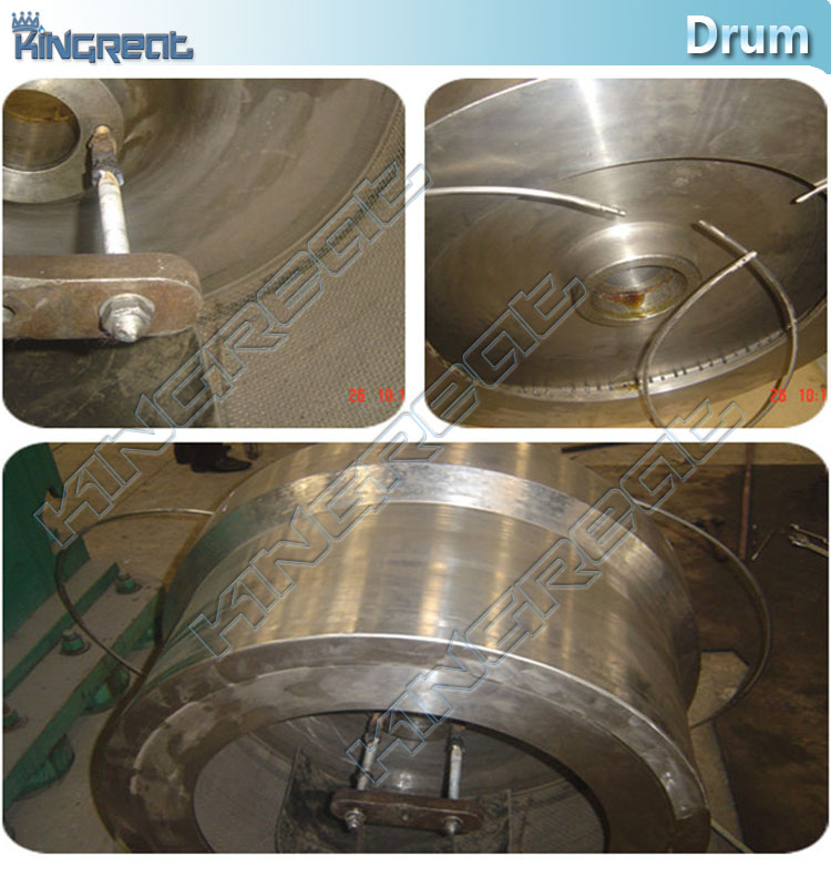 When the drum driven the motor runs at full speed, the feed valve automatically opens up and the suspension liquid goes through the feed pipe into the drum, where the liquid phase passes through the filter gauze and the screen openings on the drum and is kicked off by the centrifugal force and flows out of the tangential discharging outlet, while the solid phase is retained inside the drum. When the set time is reached, the feeding stops. After a given period of time of separation and dehydration, the washing valve acts and the cleaning liquid passes through the washing pipe into the drum to wash the filter cake. Upon the completion of washing, further separation is conducted till the required degree of dryness of the cake is reached. Then discharging starts: the scraper holder rotates enabling the scraper to cut into the cake layer and the cake is scraped off and discharged from the material hopper.