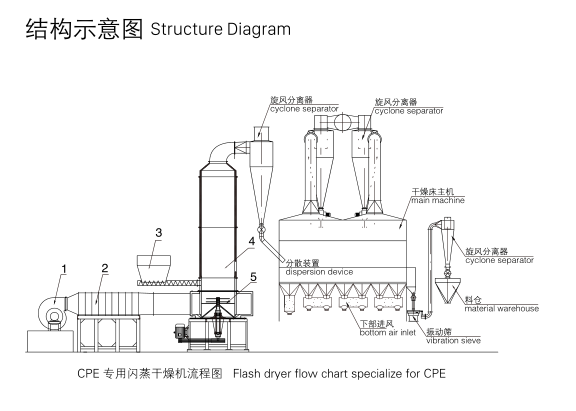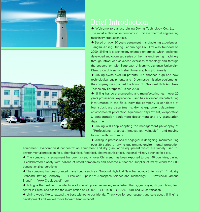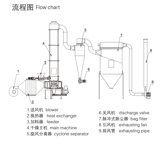 (7) Because gas speed at circle inside the drying chamber is high and the staying time of raw material is short, so it could prevent material stick to me wall and metamorphose problem, high efficiency and quick speed can be realized. It is possible for small equipment to carry out large-scale production.