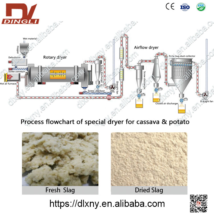 Cassava pulp, potato residue is the main by-products of the production of starch, alcohol residue, moisture content is about 80%, as for high moisture content, heavy viscosity, with the traditional drying process equipment, drying temperature is high, slag starch Gelatinization chemical reaction, dextrin clogging material particles pores, water evaporation does not come out, the particles surface turned yellowish black, "outside the coke within the soft", a serious impact on the sale of dry residue; drying temperature is low, t the moisture cannot drying below 15 % at all, dryer sticky wall, gelatinization, agglomeration, drying equipment can not do normal production,this will lead to the impaired interest of the customers.Dingli brand starch slag dryer is based on the research and development for characteristics of raw material such as cassava, potato slag, and after a few sets of dryer producing experience, which can drying all kinds of potato residue below 12% in one time. The equipment used by the company's "mechanical dehydration + drum drying + pulse air drying " special chinese patent technology, an effective solution to the traditional dryer which can not dry cassava, potato residue problems, drying material with perfect color, good quality, production line of energy saving and environmental protection ,with safe and stable operation,which praised by many new and old customers.