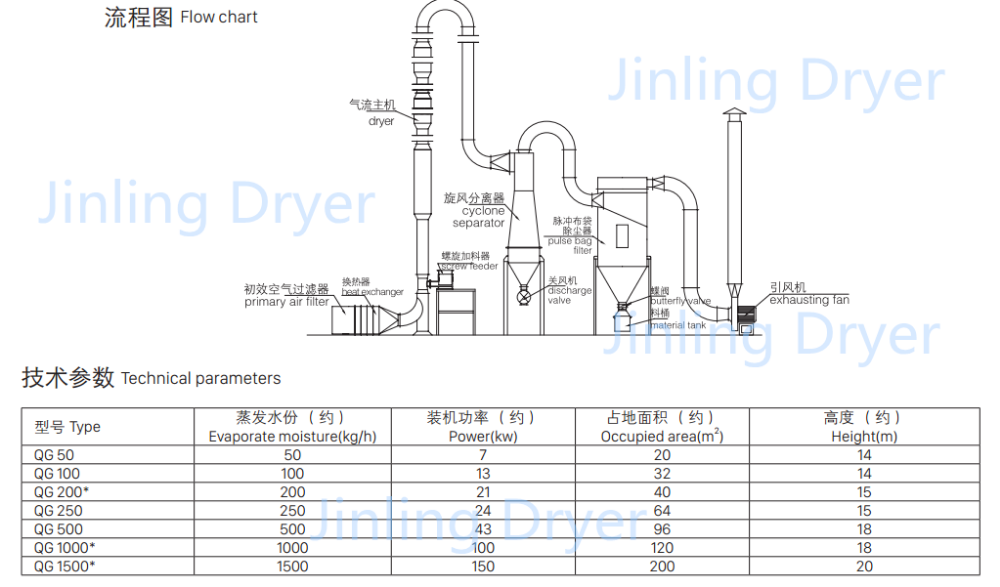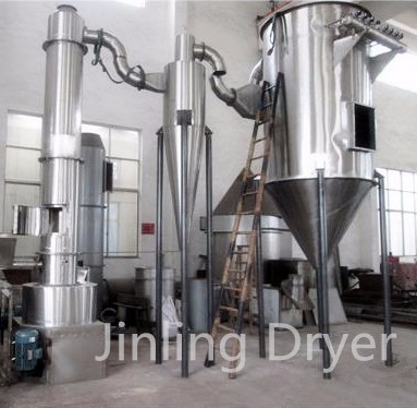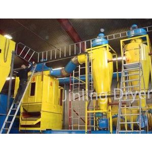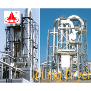 Raw material is fed uniformly into the dryer by screw feeder. Wet material is blowed up quickly in drying chamber by hot air. Product discharged continuously after drying and separation. Drying time is generally several seconds.