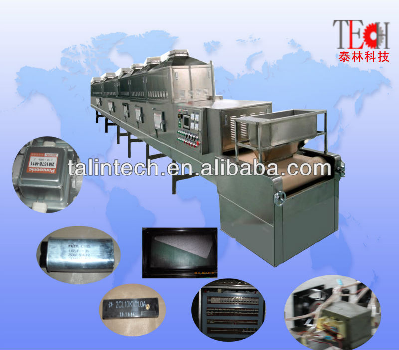 Microwave food drying and sterilization equipment (figure) used in a variety of food, agricultural products, seafood, etc.) and pharmaceutical, etc of drying and sterilization (bulk, bottled, packaged, flake, powder, etc.).Bottled drinks, vacuum packing peanuts, dried chicken, chicken, pork, bean curd cake, nuts, such as chilli sauce sterilization.