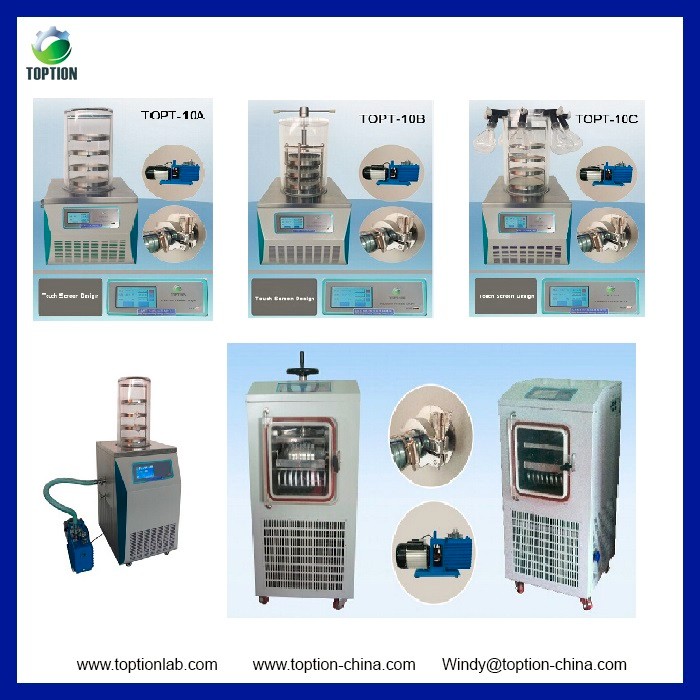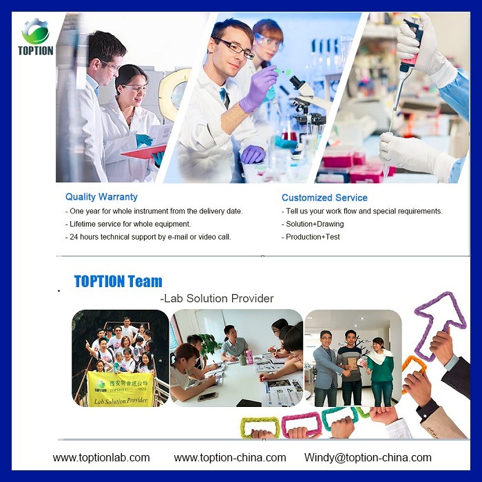 TOPTION Laboratory Spray Dryer assembles many of new design, for example, small size for free moving, combining air compressor and electrical heater inside the cabinet, glass spray and cyclone separator for inspecting. All the data and functions are controlled by PLC.