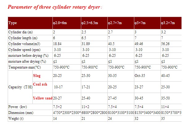 The three drum sand dryer can be applied in drying raw materials such as yellow sand, slag, clay, quartz sand etc...It's widely used in industries such as dry mortar, cement, building materials, glass, chemicals, and casting etc.