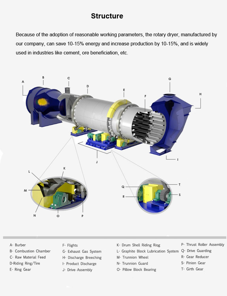 Rotary dryer’s heat source is a combustion apparatus. It adopts direct flow heating with heat source from firing unit. The material to be dried is pushed back immediately by spiral board after going in the shell from feeding tank or feeding chute. Because the drier is installed in an inclined position, material flows to the back end under gravity and rotation force. At the same time, it is lifted by board repeatedly and thrown down accordingly, which makes the material form an even curtain, so that it can exchange heat sufficiently with the heat flow. At last, water in the material is dried by repeatedly scattering.Industrial Dates Animal Feed Sludge Chicken Manure Sawdust Roller Kiln Rotary Drum Dryer Drying Machine Equipment Price For Sale