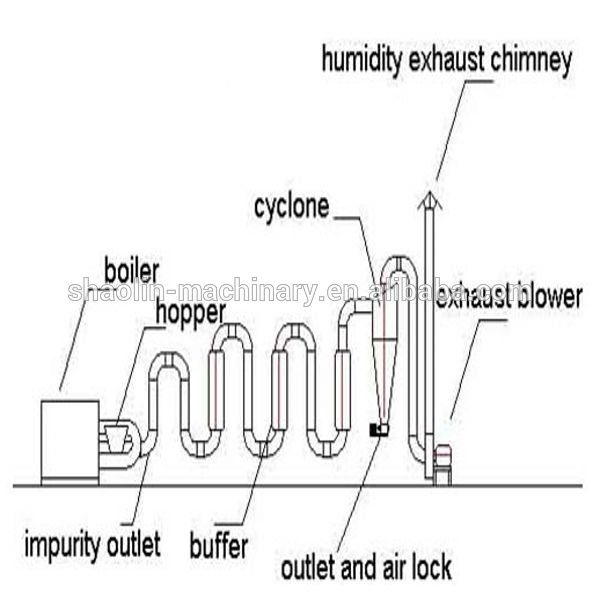 The damp/wet fiber raw material like sawdust from sawdust crusher or after crushing wood particle through the material feeder conveyer to the drying pipe .and flue gas or heated fresh air enter into the drier at the same time.They are mixed fully.