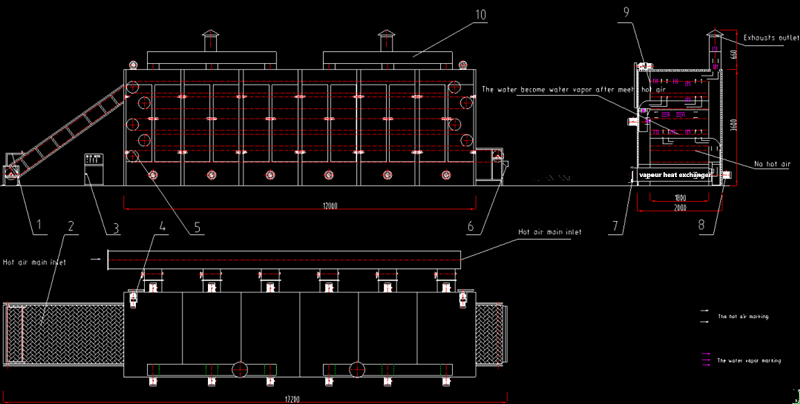 Its main principle is to put the material evenly spread in net, net belt with 12-60 steel mesh belt, reciprocate by dragging gear in dryer, hot air between the material flows and water vapor from moisture discharge hole, so as to achieve the purpose of drying.