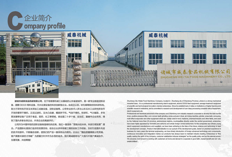 Zhucheng WeiTai Food Machinery Co., LTD(WT). is specialized in the production of complete set equipment for the processing of starch, We are located in zhucheng city - the popular food machinery industry zone of Shandong province, which is famous in China. This is a very advantageous location for human resources, raw materials procurement as well as technology developments. Since our establishment 8 years ago, we have been focused on the research development and manufacturing of diverse and advanced facilities to produce starch, starch sugar, alcohol and citric acid.