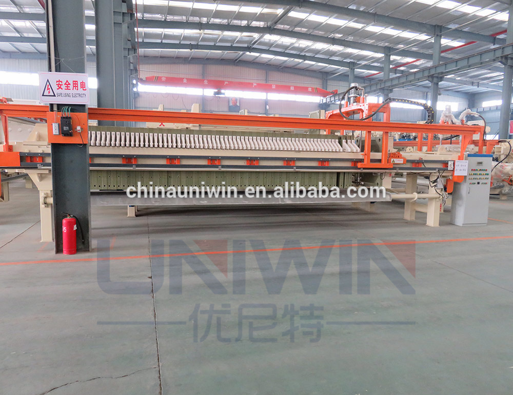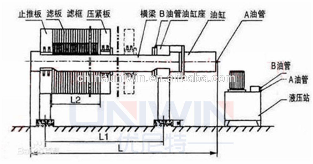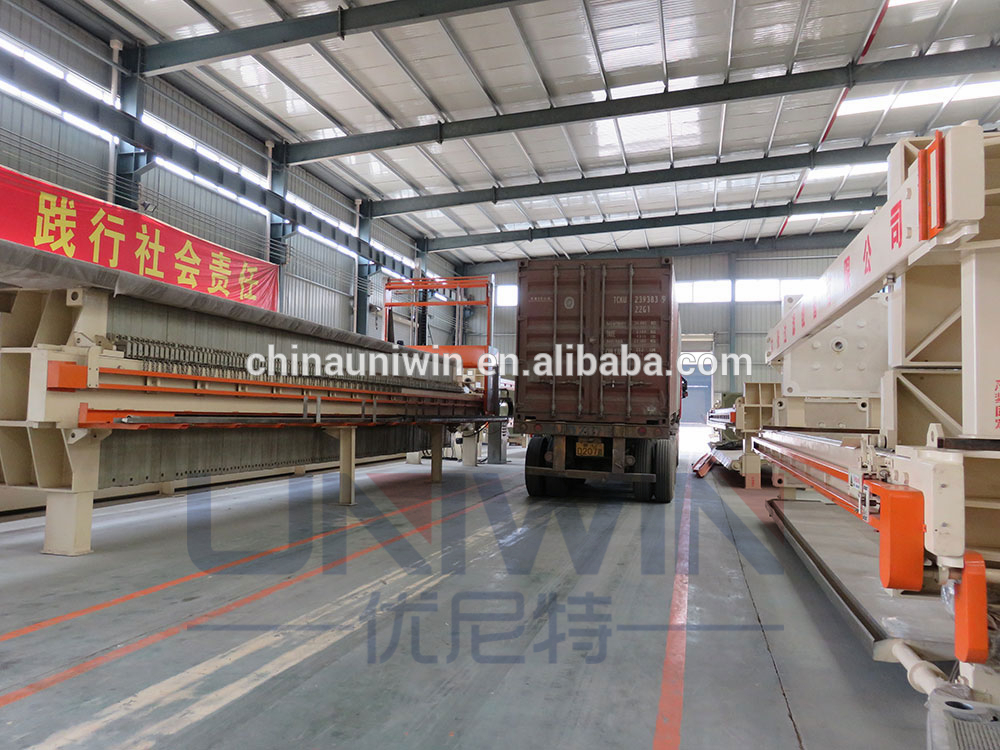 In the process of operation, press system(piston of the oil cylinder or lead screw drive ) push the head plate, compress the filter plate and filter cloth between head plate and end plate, then the filter chamber is formed between the compressed filter plate and filter cloth. Materials that are pushed by the feeding pump enter into each filter room through feeding hole of end plate. In this way, solid particles will be intercepted in the filter room and formed filter cake. And liquid will discharge from the liquid hole through filter cake and filter cloth. If it needs to wash the filter cake, we can use scouring water by washing hole of the tail-board. If it needs to dry the filter cake, feed into compresses air through washing hole.