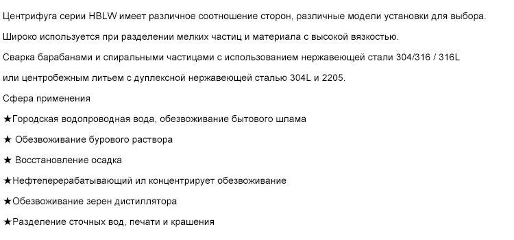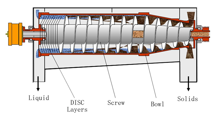 Horizontal spiral discharge sedimentation centrifuge (referred to as decanter centrifuge) is an effective separation equipment which use centrifugal acceleration generated by high-speed rotation into the acceleration of gravity to shorten thousands of times of the settlement time of solid particles than in the gravity field. The solid particles are discharged from the drum through the screw conveyor continuously and without interruption.