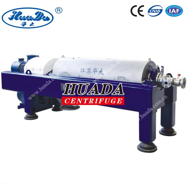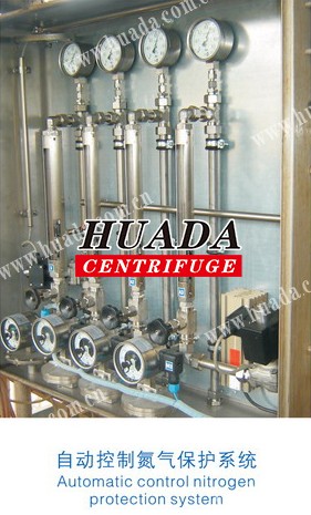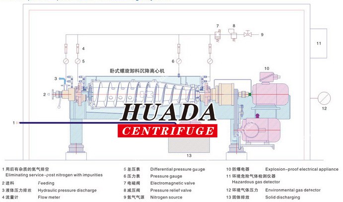 The centrifuge is used in explosive or flammable applications in chemical industry, petrochemical industry, pharmacy industry and other industries, and any leakage of gas into the external atmosphere is prohibited in the course of solid-liquid separation, or used in solid-liquid separation in applications in which explosion may be caused if the external air enters the inner chamber of the centrifuge. Both ends of the bowl and the liquid outlet are airtight to achieve the airtight and flameproof effect.