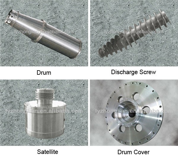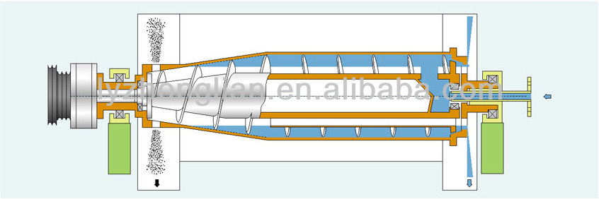 The solid drum is internally installed with a concentric discharge screw As they rotate in the same dJreotion at a high speed, They have a certain rotational speed difference, which is caused by the driving system and the differential case Suspension enters the internal of the charge screw through the speed pipe and then goes into the drum after being accele rated Under the centrifugal force, solid particles of big density settle on the inwall of the drum, and form a circular layer of cake, which is continuously pushed by the discharge screw to the small end of the drum 8nd then out of it, while the set:led liquid is continuously discharge out of the drum from the vortex finder of the big end of the drum, hence solid-liquid sparation of suspension.
