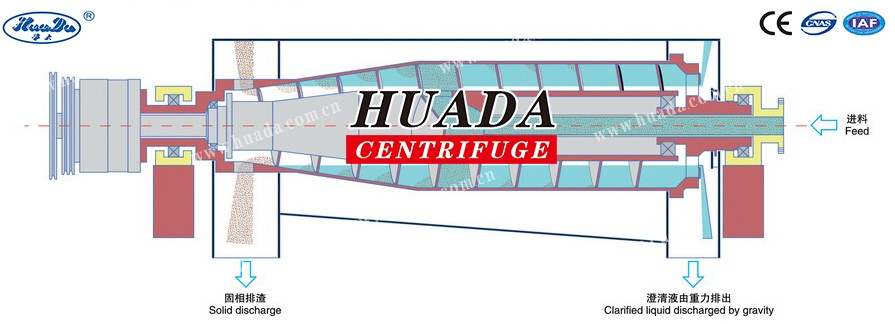 Labyrinth seal is used for both bowl ends of LW standard type decanter centrifuge, simple and convenient, after separation, the solid phase is conveyed to the solid discharge port by scroll conveyor, and discharged out of centrifuge under centrifugal force caused by high speed rotation; while the liquid phase drains out under gravity and centrifugal force through the overflow plate. This series decanter centrifuge features easily operation, continuous and stable running, and wide application scope.