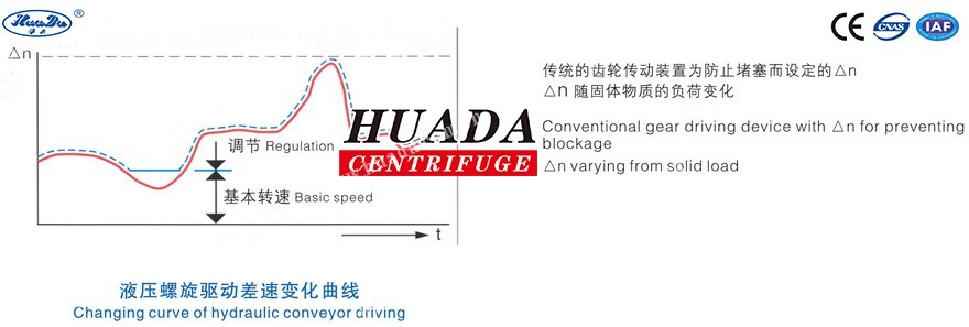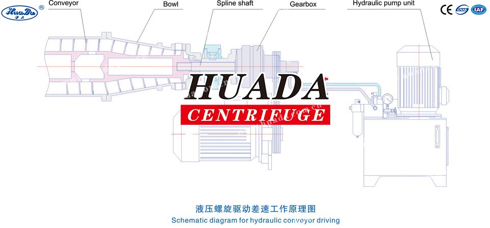 The hydraulic conveyor driving is a closed driving system, including the centrifuge bowl and conveyor. It is independent from the bowl driving. The hydraulic conveyor driving is different from other mechanical conveyor driving system which relies on bowl rotating to generate differential speed. The hydraulic driving device is directly mounted on the conveyor assembly, and is driven by hydraulic pump aggregate. Therefore it is independent from the bowl driving system.