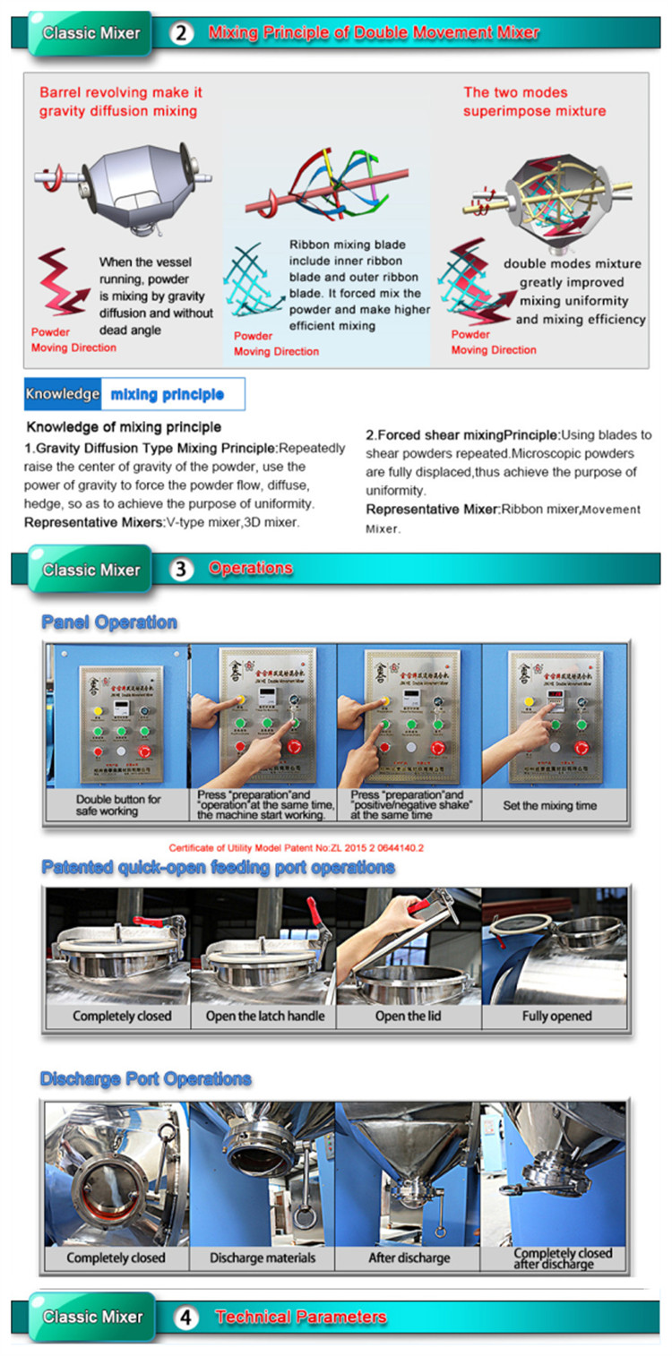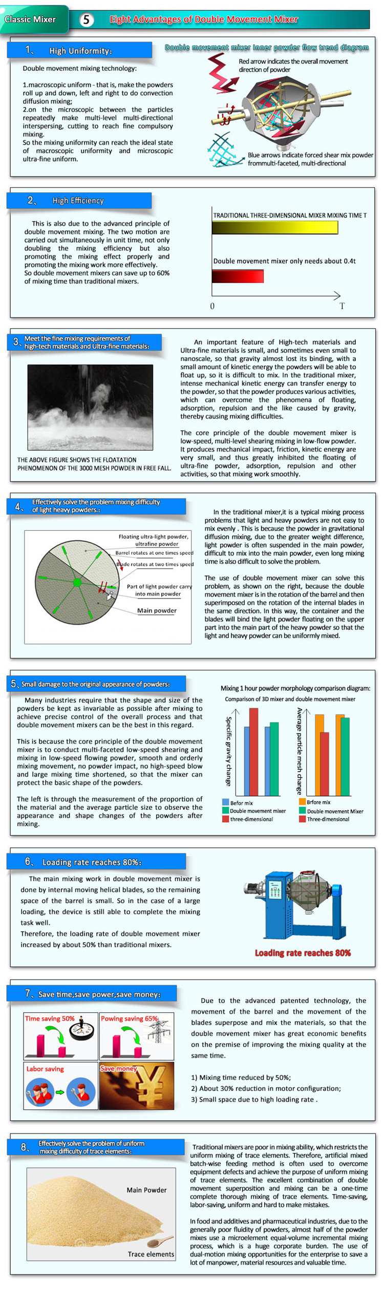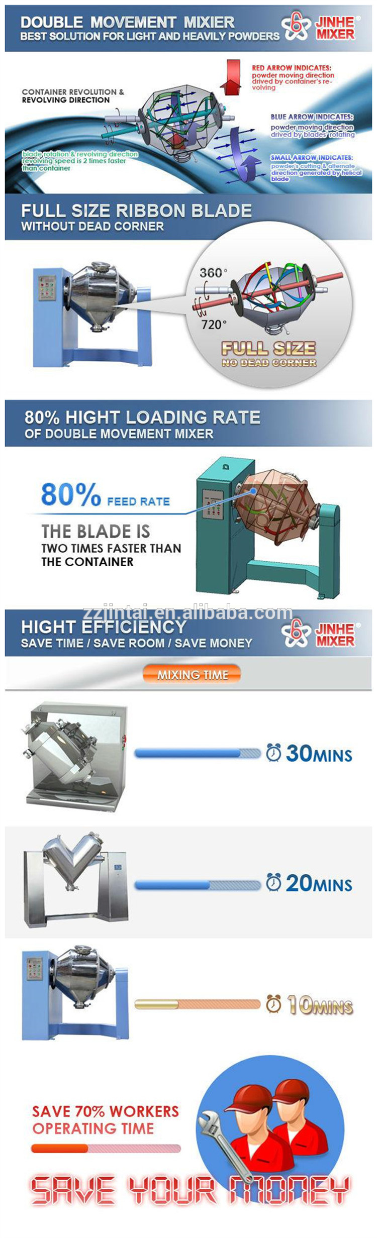 A:Yes, absolutely. Our double movement series mixer have unique structure over the world. The barrel rotating while the inside 8 full size helical blades rotating also. The barrel rotating like a 3D mixer. The inside helical blades can do cutting, dividing,pressing job. If our machine used to mix normal powders like milk powder,detergent powder,protein powder, etc.....it will need less time than other mixer.