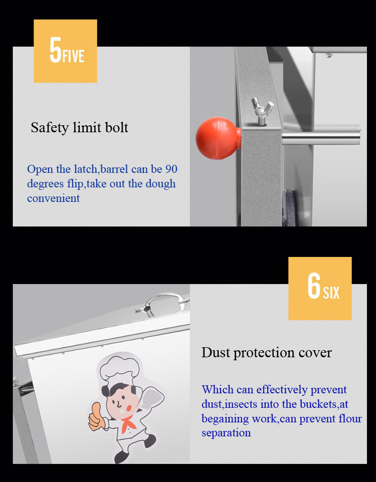 (1) single motors to achieve action & speed run and with a low speed to achieve a strong degree of mixing. The special structural design, making a low friction temperature during mixing and making temperature of dough raise up slowly, stirring with a high success ratio.