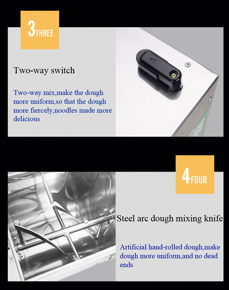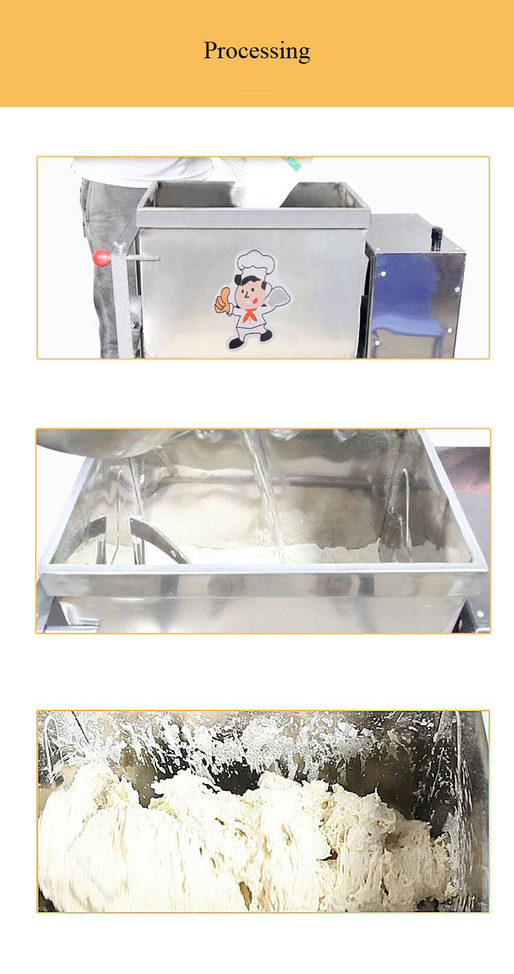 Dough mixer is the main equipment of pasta processing. It is mainly used to mix dough with wheat flour and water at a ratio of 1: 0.38-0.45 according to user's processing requirements (sometimes adding cooking oil and other food and food additive) It is suitable for pasta processing in canteens, restaurants and pasta processing units. It is the ideal equipment to replace handwork, reduce labor intensity and meet people's diet and hygiene requirements. It can also be used for mixing and mixing other similar materials.