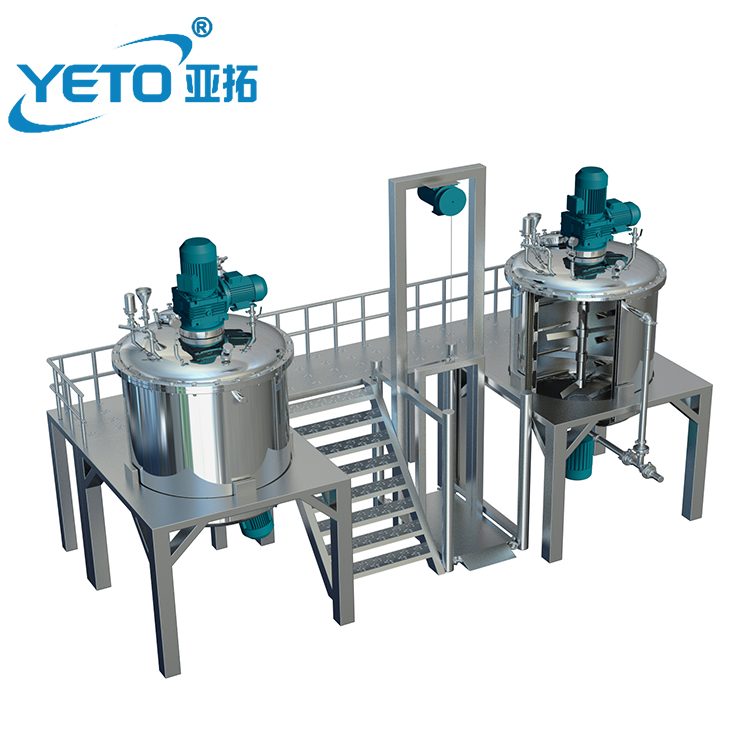 Fixed-type emulsification machine is for large-volume production of products, fixed means that its lid is connected with the pot body and can not be separated. Fixed Vacuum emulsifier mainly by the pretreatment pot, the main pot, vacuum pumps, hydraulic, electrical control systems and other components. The material will be sucked into the main pot for mixing, homogeneous emulsification after been fully dissolved in Water pot and the oil pot. Its main function is the same as lift-type emulsifier with shear, emulsification function. Mainly used in biomedicine; food industry; day care products; paint inks; nano-materials; petrochemicals; dyeing auxiliaries; paper industry; pesticides and fertilizers; plastics and rubber;