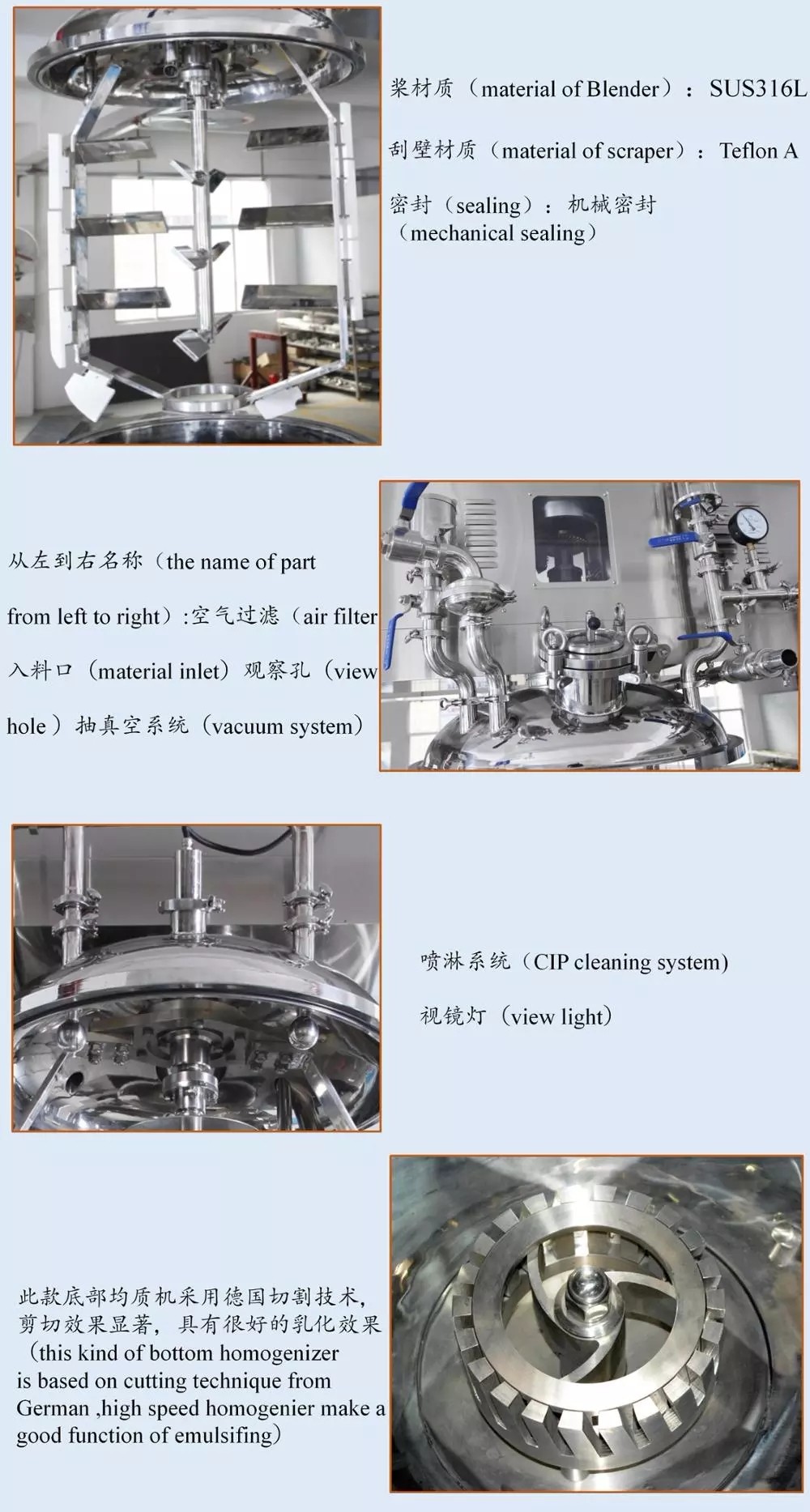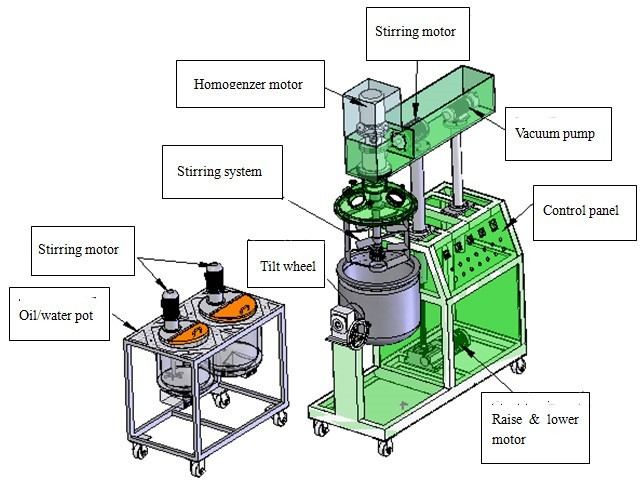 This equipment is a set of vacuum deaeration, mixing, homogenizing, heating, electric control and other functions in one, equipment is composed by the vacuum homogenizing emulsifying pot, vacuum system, a lifting system. It is also according to the requirements of the production process supporting oil and water pot.
