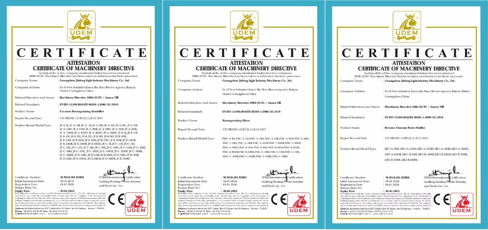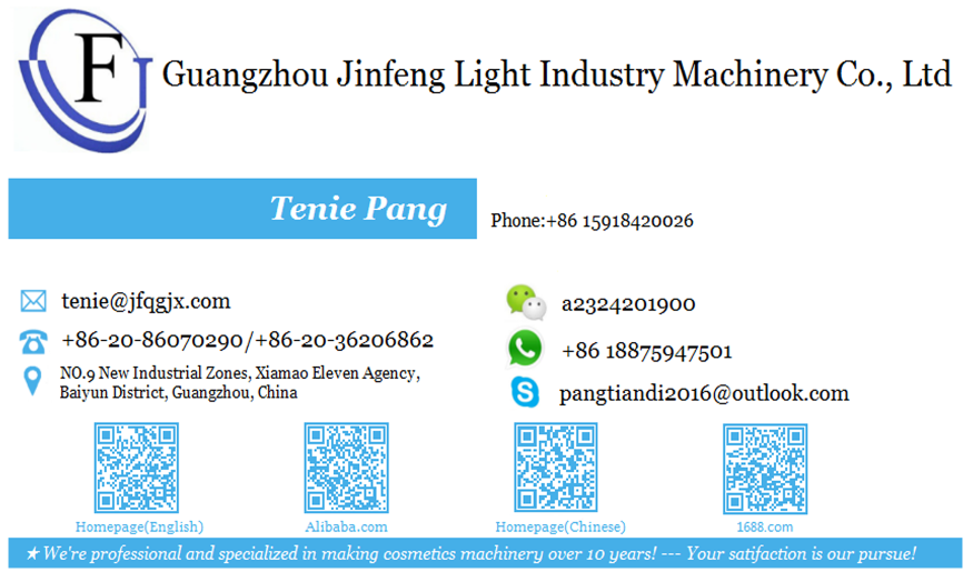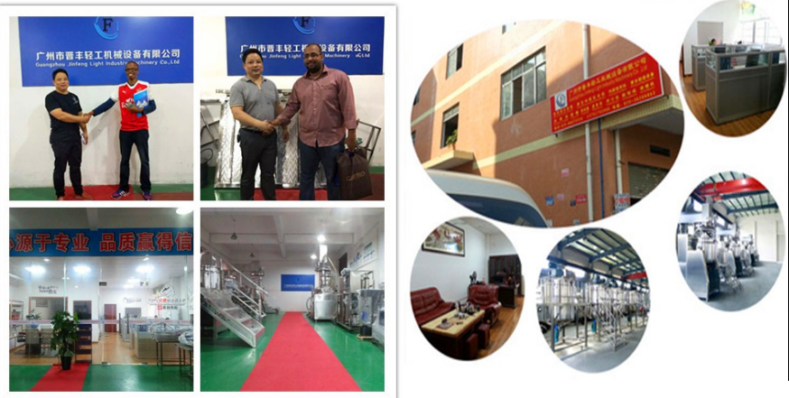 Guangzhou Jinfeng Light Industry Machinery Co., Ltd. is a manufacturer that produces cosmetic, pharmaceutical, chemical and dairy equipment. We undertake equipment design, manufacture, installation, maintenance, technical improvement support, technical consultancy and other services. Our main products are vacuum homogeneous emulsifying machines, reverse osmosis water treatment machines, automatic and semi-automatic filling machines and all kinds of stainless steel tanks. All of them are of reliable quality and good effect. We have more than ten years' experience in machinery manufacturing and our products have been entered into domestic and overseas markets. The diverse products with high quality can meet various needs of industries mentioned above.