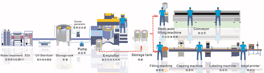 Water treatment → EDI,ultraviolet(alternative)→ water tank → Ozone generator,pump(alternative) → homogenizer emulsifier → material tank → semi-automatic filling machine → semi-automatic capping machine → semi-automatic labeling machine → inject printer → conveyor(alternative)