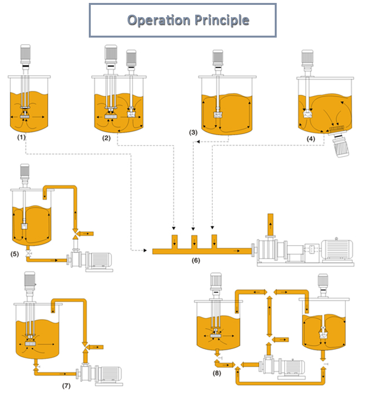 Zhuheng high shear dispersing emulsifier effectively, quickly and evenly disperse a phase or usually, there phases are dissolvable to each other. The rotor revolves quickly and strong force is produced through high tangent speed and high frequency mechanical effect ,therefore ,the material in the narrow slotamong stator and rotor receives strong forces from mechanical and liquid shearing ,centrifugal force, pressing ,liquid fraction, clashing ,tearing and rush water .The dissolvable solid ,liquid and gas material is then instantly dispersed and emulsified evenly and finely with better production procedures and appropriate addictives and finally products with stable high quality are made.