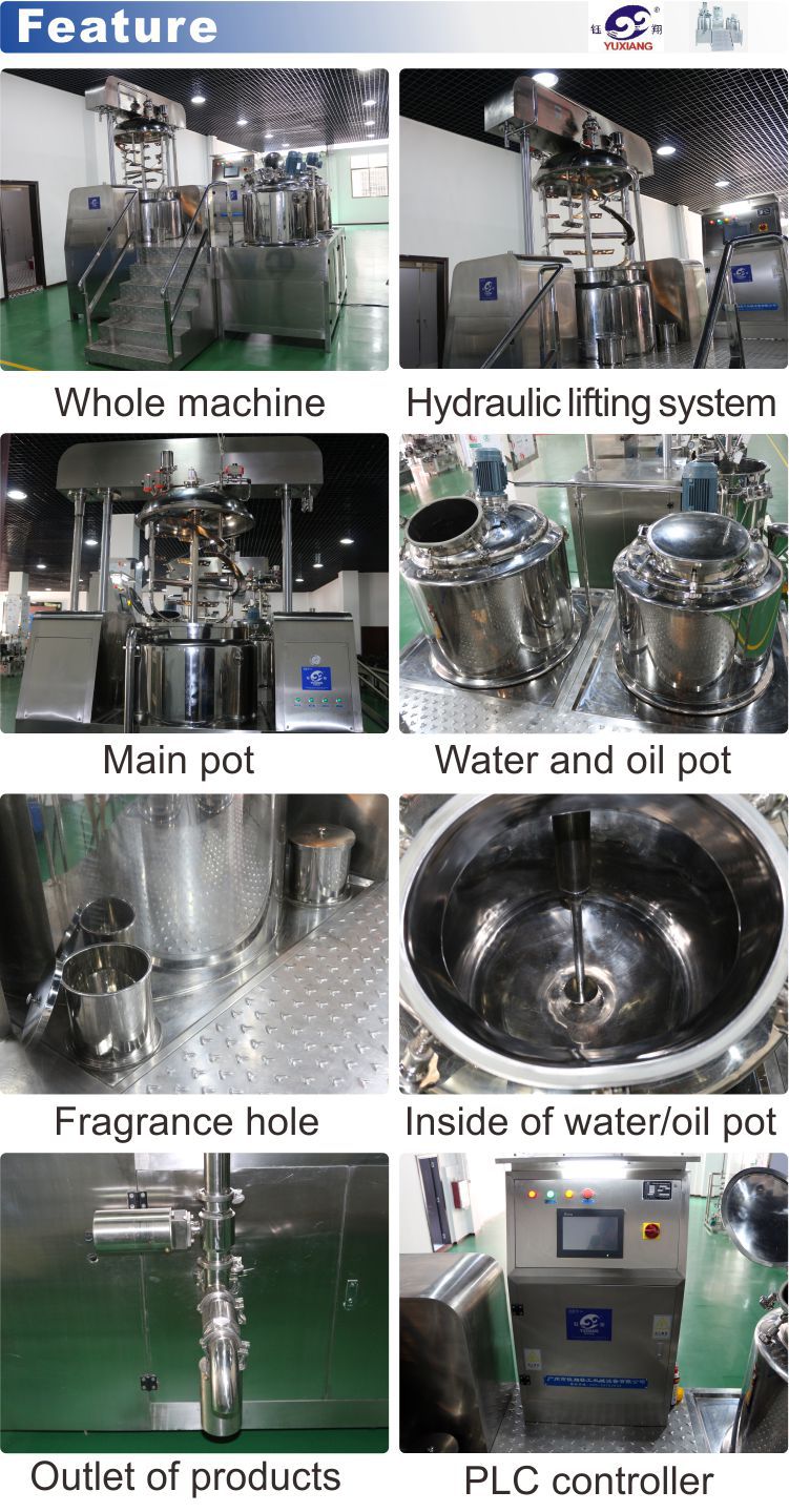 Name | Frame-wall scrapping oar | Homogenizer | heating for main pot | heating for oil pot | heating for water pot | disperser of oil pot | disperser of water pot | vacuum Pump | hydraulic lifting |