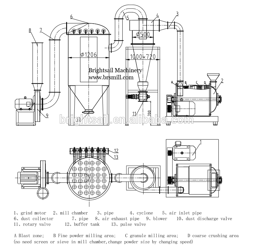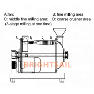 3) The mill part combines coarse crusher, middle fine mill and fine mill together, which means it can makes fine powder directly from big raw material, very effective.