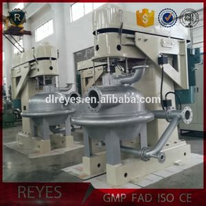 When the rotating drum running a high speed, when the material enter into the disc separation area through the feeding pump (1), under the action of the centrifugal force field, the starch particles slip to the inside wall of the drum, discharged from the nozzle(2),and the light phase like protein and others will collect to the drum center, discharged out of the machine via centripetal pump(3).The machine has a washing bottom pump, the washing water into the drum from the vertical center hole(4), it is used for washing the yellow paste of the starch material, and effectively improve the quality of starch.