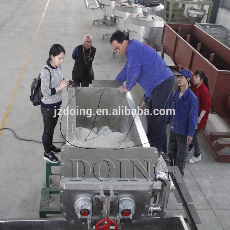 4. After 12 minutes, put the water into the hopper again, then open the machine to work about 3 minutes, then stop, let the flour batter flow through the hole of machine.