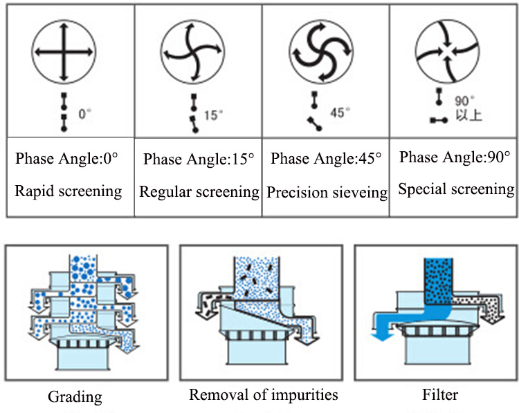 Fowder vibrating sieve machine as a piece of powdery material screening equipment, uses horizontal vibration motor or special vibration exciter as its vibration source. The horizontal vibration motor and vibration exciter have a eccentric block at the both at their upper and lower sides. The eccentric blocks cangenerate a three-dimensional movement in horizontal, vertical and inclined directions. By adjusting the phase angles of the upper and lower eccentric blocks, the material on the screen can change the movementlocus, achieving suitable screening performance.