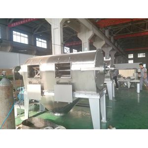 The cylinder screen-mesh of this device is placed the base machine. The materials mixed with airflow and atomization pass the screw conveyor device, enter the net tube. The undersize materials are sprayed through the screen cloth and diacharged from the fine stuff outlet under the action of centrifugal force and cyclone propelling power, which caused by the rotor vane inside the net tube. The oversize material, which can not cross the net, is discharged from the rough material outlet along inside surface of the tube.