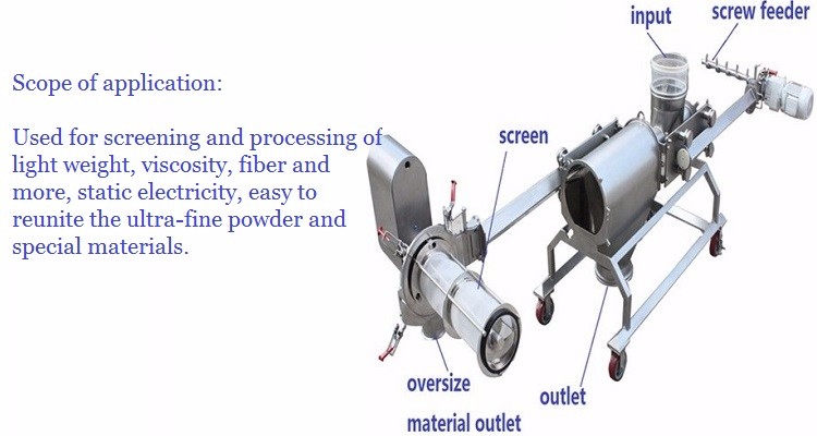 Horizontal cyclone sieve mesh is cylindrical, placed in the body.Material through the screw conveying system, mixing and atomization with air then flow into a net barrel.The material is driven by the centrifugal force and the cyclone propelling force through the wind turbine blades in the net tube, so as to force the material to be sprayed through the net and discharged from the fine material discharge port,those not pass through the net is discharged from the coarse material discharge port along the cylinder wall.