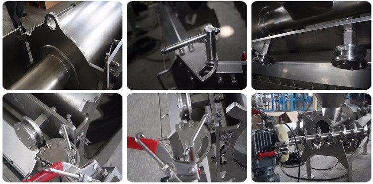 3)Specialized extraction device pull buckets allows both of the feeding screw and screen basket totally to the outside without any tools,for thorough clean and inspection,quick exchange for spare parts, and easy maintenance.