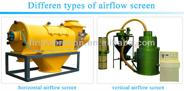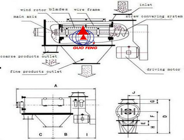 The cylinder screen mesh of this device is placed inside the machine. The materials enter the net tube with airflow to be mixed and atomized by passing the screw conveying system. Then some of the materials are sprayed through the net and discharged from the fine stuff portal by the centrifugal force and cyclone propelling power, which are caused by the rotor vane inside the net tube, while the other materials that cannot across the net are discharged from spout along the net tube wall.