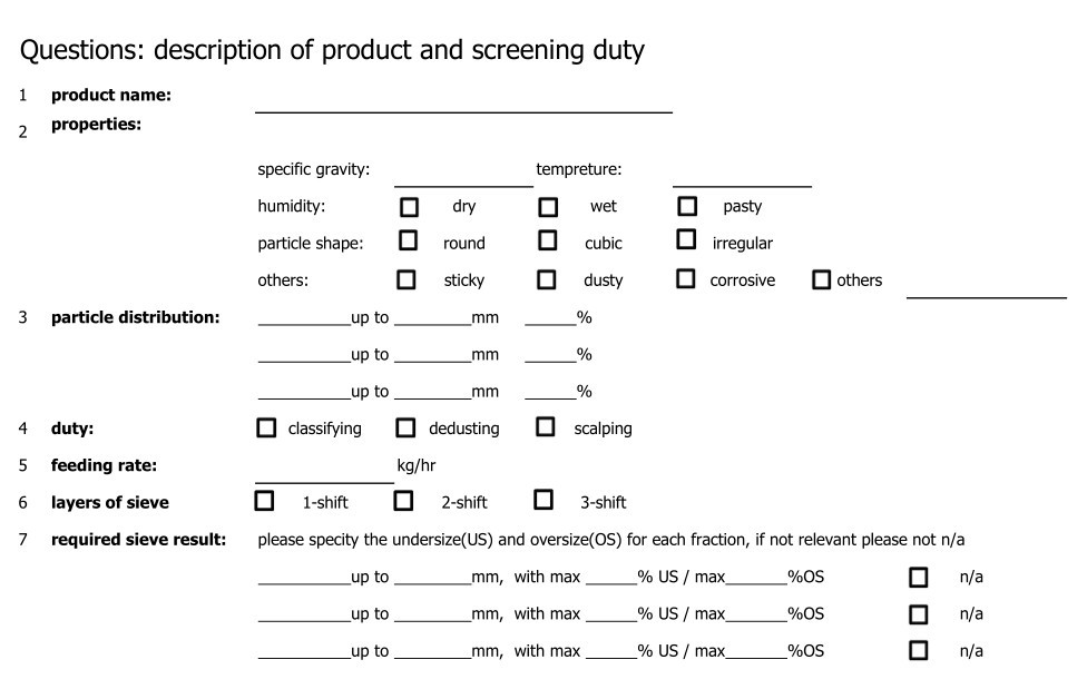 In order to choose a suitable machine for your usage, it is vitally necessary to tell us your further details of particles and requests of machines.