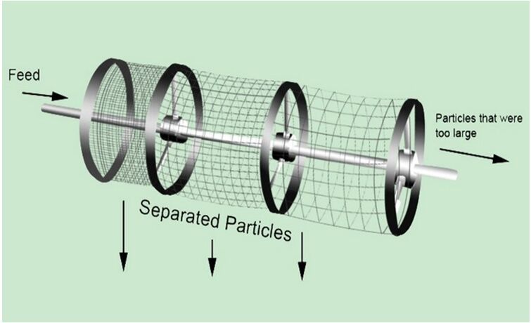 Feeding into the drum, material is lifted up by the rotation and aerated as it falls back down. This action is repeated with each revolution along the length of the drum. The finer material passes through the screen openings while the larger material tumbles towards its eventual exit at the rear of the drum.