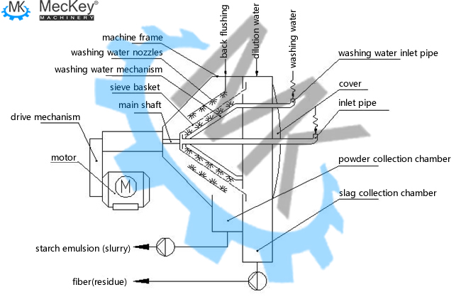 The machine has spray nozzle device both in the back and front of the sieve basket. By spraying washing water, the material move speed is accelerated whist the starch particles are easy to separate from the fiber slag.