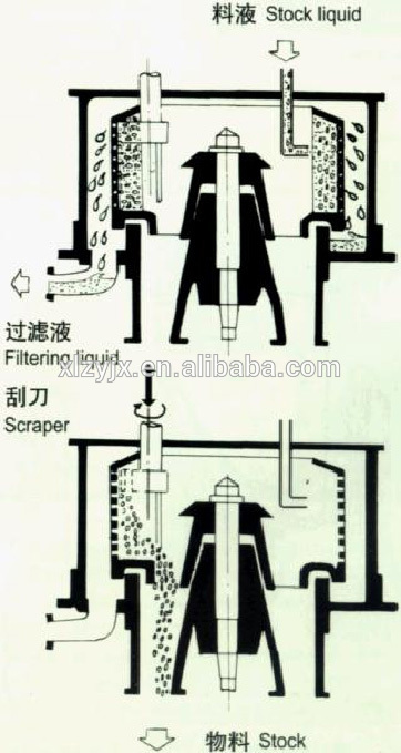 The bowl casted in stainless steel rotates simultaneously together with the main shaft, which is driven by the pulley with the conductive static V-belt by a motor. The material is fed into the basket through a feeding pipe. The material is splashed onto the bowl's wall under a centrifugal force field. The liquid flows into the casting space through the strainer and perforation, falling on the chassis and then draining out from the liquid outlet, and solid is left behind the inner surface of the strainer. The layer thickness is controlled by the special dedicated detector of the material level. Both feeding and washing will be controlled by the only used feeding valve. After the basket is turned to the state of discharging speed the solid will be scraped off by the scraper and then discharged out of the bowl from the bottom outlet.