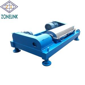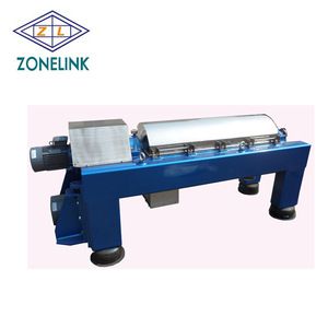 Separation takes place in a horizontal cylindrical bowl equipped with a scroll conveyor. The processing material is fed into the bowl through a stationery inlet tube and is smoothly accelerated in the accelerate chamber. Centrifugal forces cause instant sedimentation of the solids on the wall of the bowl. The conveyor rotates in the same direction as the bowl, but at a different speed, thus moving the solids towards the conical end of the bowl.