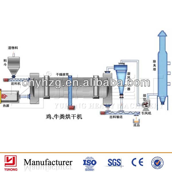 such as processing fresh chicken manure, which can be reached the purpose of drying, sterilization and save nutrition. This dryer equipped without high speed rotating drum crushing device, then increasing contact area between the material and drying medium.