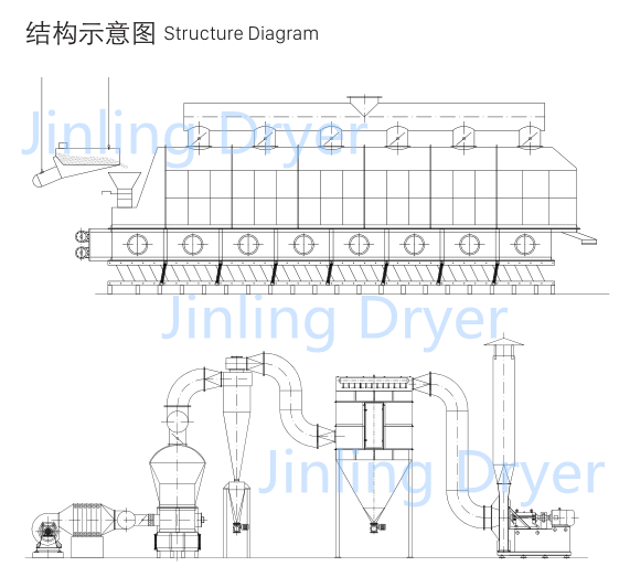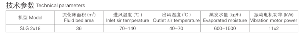 ◆ _ SLG is the modified dryer based on ZLG, it is consisted of top chamber, intermediate chamber, bottom chamber, vibration plate, vibration motor, production collection system, ventilation system etc. Vibration motor generate the force in two direction, vertical force vibrate the raw material up, cooperate with hot air, raw material is fluidized and dried inside of dryer, horizontal force transfer the product moving forward.