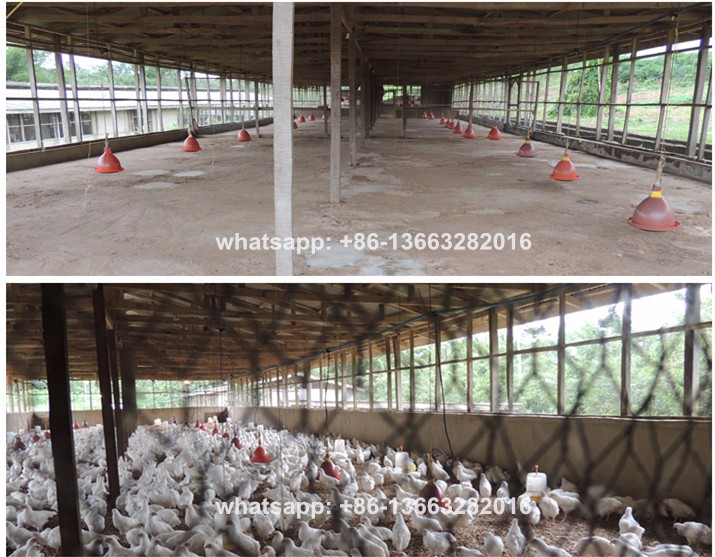 Automatic feeding line With Motor and Hopper transport the chicken food to feeding pans Automatic drinking line With big water tank or connect water tap transport water to drinkers by galvanized pipe Information 1) The height of Both line:adjusted as the chicken age 2) distance between drinking and feeding line: 1.2m to 2m 3) 11,000 chicken house size:12m by 100m |