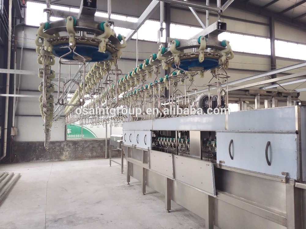 Slaughtering processing line is commonly applied to slaughtering poultry. The poultry to be slaughtered are put on the slaughtering transportation line, and the slaughtering transportation line is designed for transporting slaughtered chickens or ducks. In the process, work forces are reduced greatly. Besides, the set of equipment has a significant role in saving time and improving the production efficiency. And the equipment has an early iron capacity of 1000 ~ 12000 per hour.